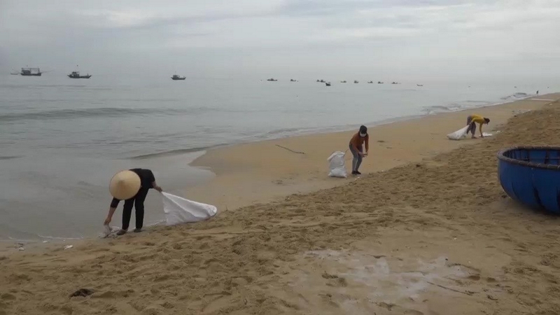 Chị em phụ nữ thôn Tân An thu gom rác thải tại bãi biển.