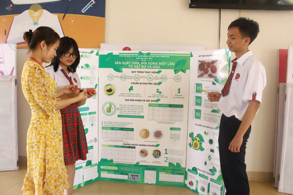 Cô Lê Thị Hoàng Phương và hai học trò cùng thực hiện công đoạn định khuôn sản phẩm. Vừa trở về từ Vòng chung kết Cuộc thi Khoa học kỹ thuật cấp quốc gia dành cho học sinh trung học năm học 2019 - 2020 được tổ chức tại TP. Đà Nẵng, cô giáo Lê Thị Hoàng Phương cùng hai học trò là Đỗ Thị Đình Nguyên (lớp 10A2) và Võ Đức Dũng (lớp 10A4) của Trường Tiểu học, THCS & THPT Hoàng Việt (TP. Buôn Ma Thuột) vẫn còn cảm thấy dư âm của niềm vui chiến thắng khi Dự án “Sản xuất thìa, đĩa dùng một lần từ hạt bơ và gạo” của nhóm đoạt giải Ba.
