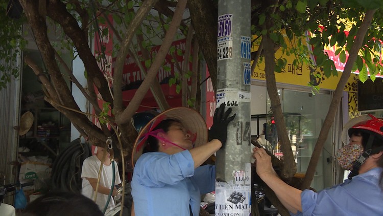 Hội viên phụ nữ thành phố làm sạch các tờ quảng cáo trên các cột điện, tường nhà