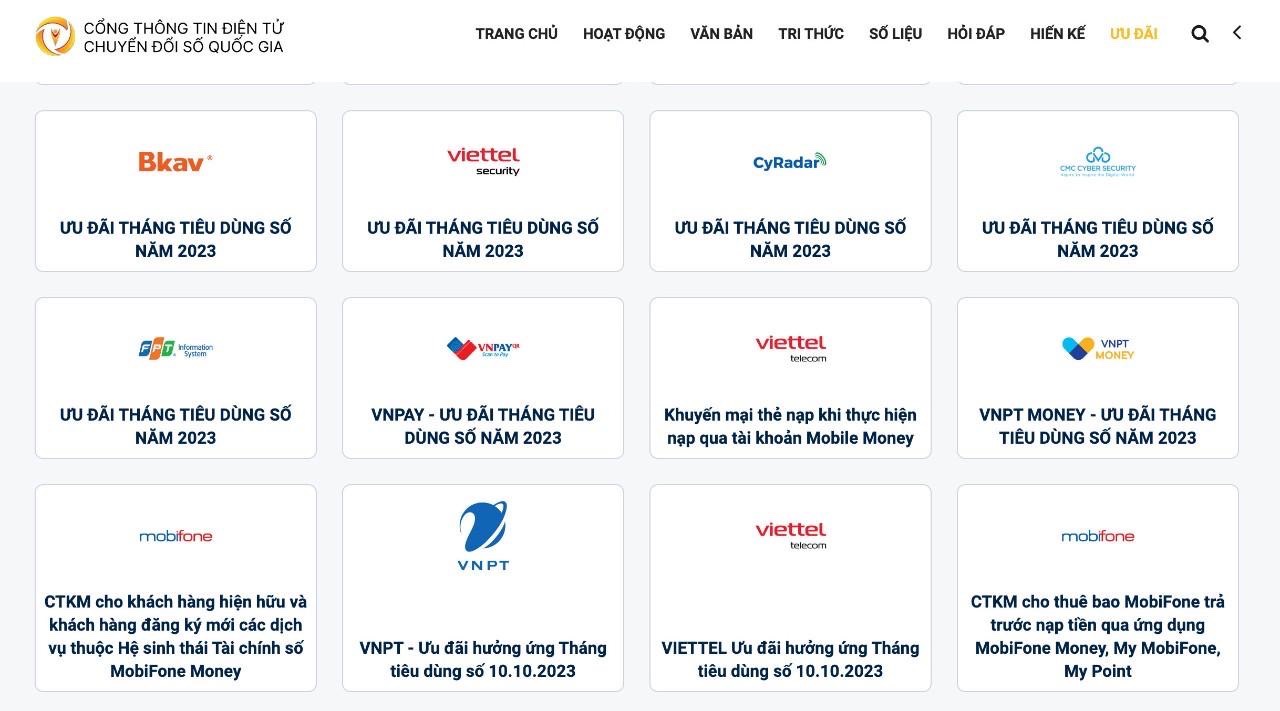Ghi nhận đến nay, “Tháng 10 - Tháng tiêu dùng số” năm 2023 đã thu hút hơn 50 doanh nghiệp trong 09 lĩnh vực tham gia. Đặc biệt, có nhiều chương trình ưu đãi đã được doanh nghiệp triển khai hưởng ứng Ngày Chuyển đổi số quốc gia từ sớm, trước tháng 10/2023 và có các chương trình ưu đãi kéo dài dư âm của Ngày Chuyển đổi số quốc gia đến sau tháng 10/2023.