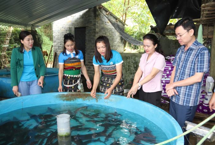 Lãnh đạo Hội LHPN tỉnh và xã Sơn Điện thăm cơ sở nuôi cá tầm của gia đình chị Lực.