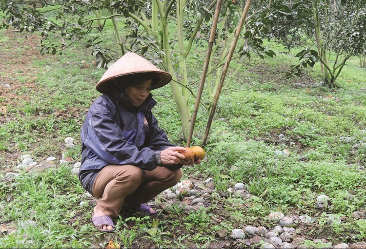 Chúng tôi đến xã Vĩnh Phúc, huyện Bắc Quang (Hà Giang) ngay sau những ngày cam rụng thành suối do ảnh hưởng của mưa đá bất thường. Trên những vườn đồi rộng hàng trăm ha, tận mắt chứng kiến cảnh hầu hết là phụ nữ ở đủ các lứa tuổi cặm cụi gom cam rụng để chôn lấp, tỷ mẩn rắc trấu trên hầu khắp các ngả đường để phòng chống dịch bệnh từ hậu quả thiên tai để lại.