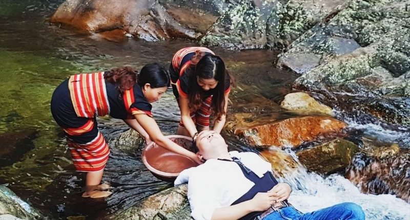 Gội đầu bằng nước lá rừng truyền thống của người Pa Cô, một trong những trải nghiệm tuyệt vời ở làng du lịch A Nôr
