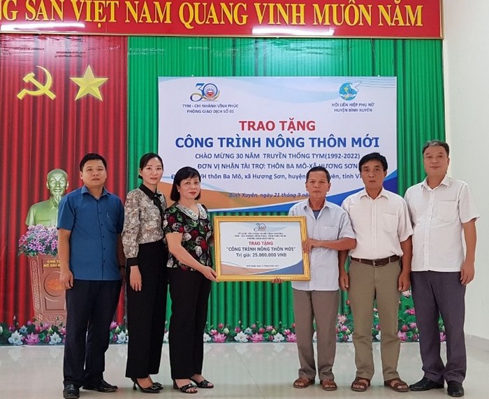 Hướng tới kỷ niệm 92 năm thành lập Hội LHPN Việt Nam (20/10/1930 - 20/10/2022) và kỷ niệm 30 năm truyền thống Tổ chức tài chính vi mô TNHH MTV Tình Thương (TYM) (1992 - 2022), TYM Chi nhánh Vĩnh Phúc tổ chức trao tặng công trình nông thôn mới cho thôn Ba Mô, xã Hương Sơn.