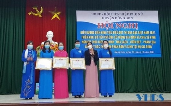 UBND và Hội LHPN huyện Đông Sơn vừa tổ chức biểu dương điển đình tiêu biểu trong đợt thi đua đua đặc biệt năm 2021; chia sẻ kinh nghiệm thực hiện mô hình “Nhà sạch vườn mẫu”, “Nhà sạch vườn đẹp - Tường rào xanh - Phân loại xử lý rác thải làm phân bón vi sinh tại hộ gia đình”, góp phần thực hiện có hiệu qủa Đề án nhân rộng và nâng cao chất lượng câu lạc bộ “Xây dựng gia đình 5 không, 3 sạch” và chương trình xây dựng NTM kiểu mẫu của huyện. Đến nay toàn huyện đã có 1.000 hộ cải tạo vườn tạp, xây dựng 100 vườn mẫu…