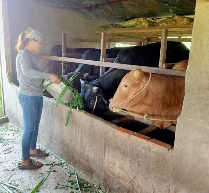 Chị Trần Thị Thanh đang cho đàn bò ăn cỏ