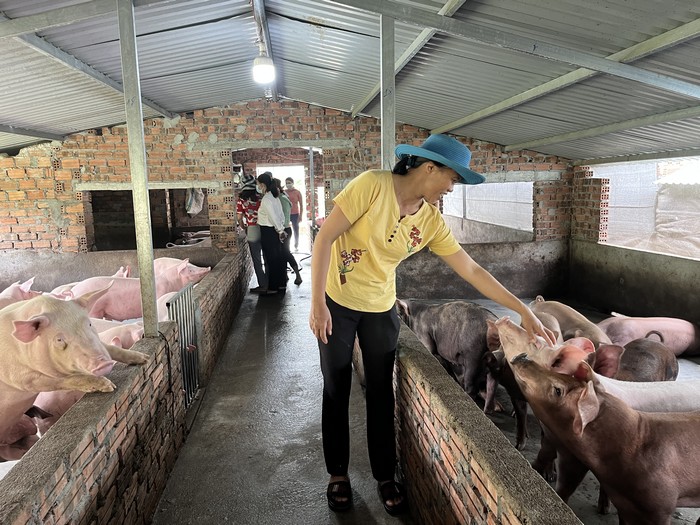 Chị Trần Thị Hồng bên trang trại nuôi heo của gia đình
