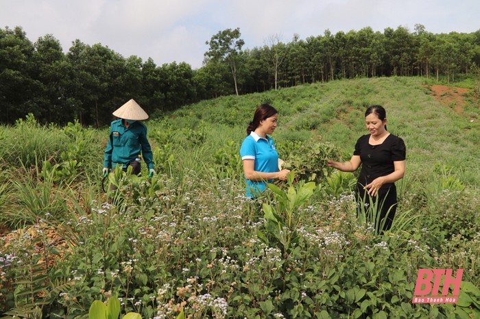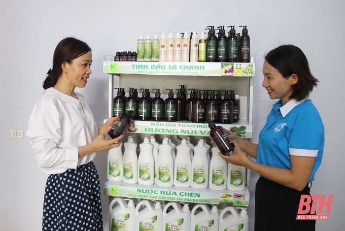 Chị Lê Thị Tứ (bên trái) giới thiệu những dòng sản phẩm do HTX Nông dược núi Vần xã Vĩnh Phúc (Vĩnh Lộc) sản xuất Toàn bộ khu đồi của gia đình chị Thứ rộng khoảng 5 ha, phía trên đồi được trồng các loại cây dược liệu như: sả, ngũ sắc, hương nhu, dứa...; ngay phía chân đồi, trong khu vườn bao quanh nhà được trồng các loại cây bưởi, ổi, đinh lăng, hoa ngũ sắc, mần trầu, lá lốt... Vườn đồi của gia đình chị cũng nằm ở vị trí khá đẹp, giáp với hồ Mang Mang nơi có tiềm năng phát triển du lịch sinh thái nên phong cảnh ở đây vô cùng bình yên, thoáng đãng.