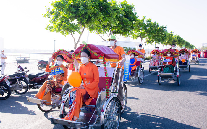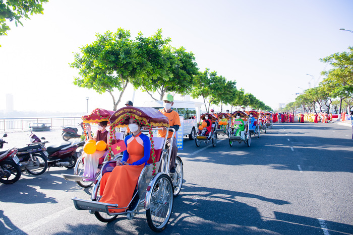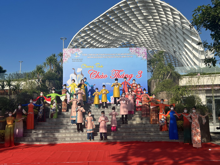 Nhiều phụ nữ mặc áo dài ngồi xích lô đi diễu hành. Ngày 1/3, Hội LHPN TP Đà Nẵng tổ chức chương trình "Chào Tháng 3". Đây là chương trình nằm trong chuỗi hoạt động chào mừng kỷ niệm 112 năm Ngày Quốc tế Phụ nữ 8/3 và 1982 năm Khởi nghĩa Hai Bà Trưng, chào mừng Đại hội Đại biểu Phụ nữ toàn quốc lần thứ 13, hưởng ứng hưởng ứng sự kiện Tuần lễ áo dài năm 2022.