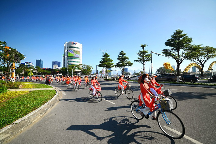 Phụ nữ TP Đà Nẵng mặc áo dài thướt tha diễu hành bằng xe đạp quanh một số tuyến đường chính của thành phố.