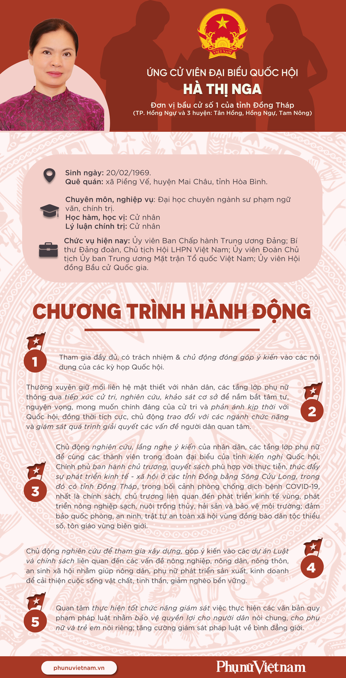 Chủ tịch Hội LHPN Việt Nam Hà Thị Nga được Hội đồng Bầu cử Quốc gia phân bổ ứng cử đại biểu Quốc hội khóa XV tại đơn vị bầu cử số 1 của tỉnh Đồng Tháp gồm Thành phố Hồng Ngự và 3 huyện: Tân Hồng, Hồng Ngự, Tam Nông.
