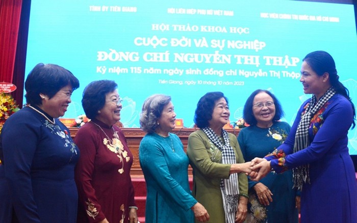 Ủy viên TƯ Đảng, Chủ tịch Hội LHPN Việt Nam Hà Thị Nga (bìa phải) và nguyên Bí thư Trung ương Đảng, nguyên Phó Chủ tịch nước Trương Mỹ Hoa (thứ 3 từ phải sang) trao đổi cùng các đại biểu tại Hội thảo Sáng ngày 10/10, Trung ương Hội LHPN Việt Nam phối hợp với Tỉnh ủy Tiền Giang, Học viện Chính trị Quốc gia Hồ Chí Minh tổ chức Hội thảo khoa học "Cuộc đời và sự nghiệp đồng chí Nguyễn Thị Thập".