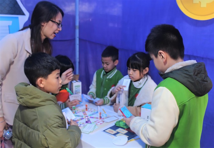 Các em học sinh tham gia trò chơi trải nghiệm tại chương trình Diễn đàn là hoạt động thiết thực của Hội nhằm chuyển tải các nội dung cơ bản về giáo dục kỹ năng quản lý tài chính sớm, bình đẳng giới đến với các em học sinh ngay khi còn đang ngồi trên ghế nhà trường.