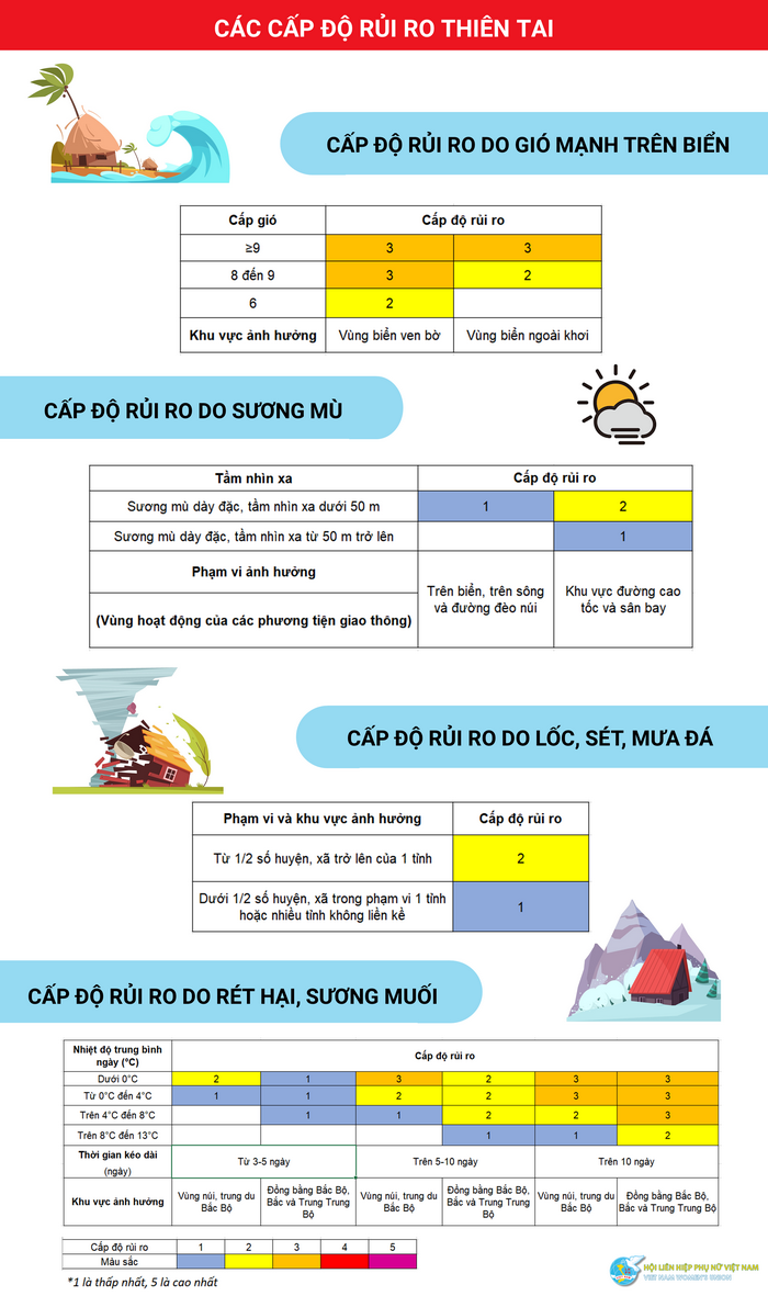 Cấp độ rủi ro do gió mạnh trên biển/ sương mù/ lốc, sét, mưa đá/ rét hại, sương muối trong cảnh báo rủi ro thiên tai.