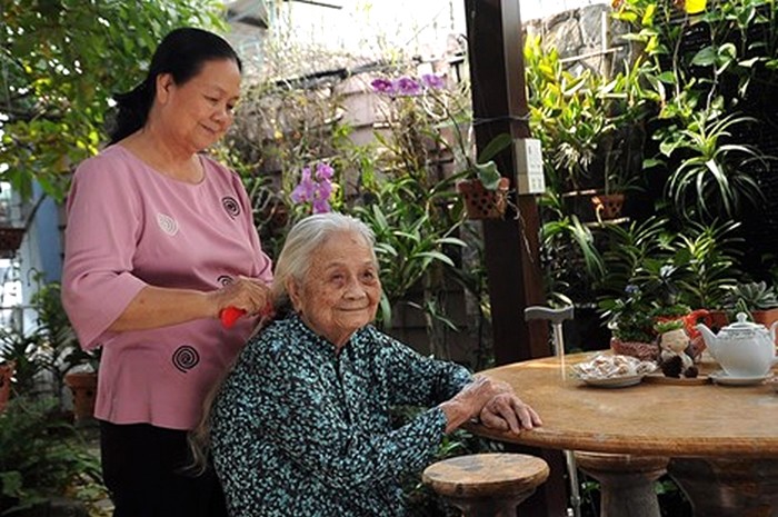 Bà Lê Thị Thanh Phương - nguyên Phó Giám đốc Sở Xây dựng luôn ân cần, chu đáo chăm sóc cho mẹ là bà Lê Thị Huệ. Ảnh: Tùng Thiện