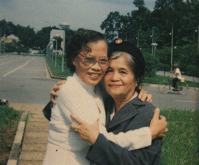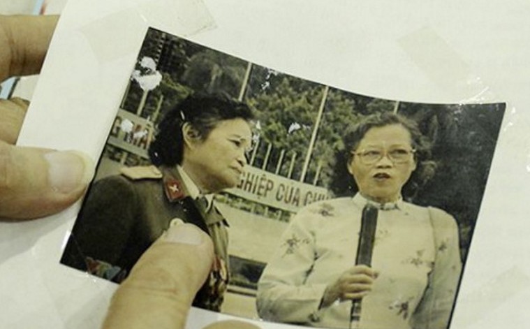 Bà Lê Thi (trái) và bà Đàm Thị Loan năm 1987 - hai người phụ nữ kéo cờ tại sự kiện lịch sử trọng đại năm 1945