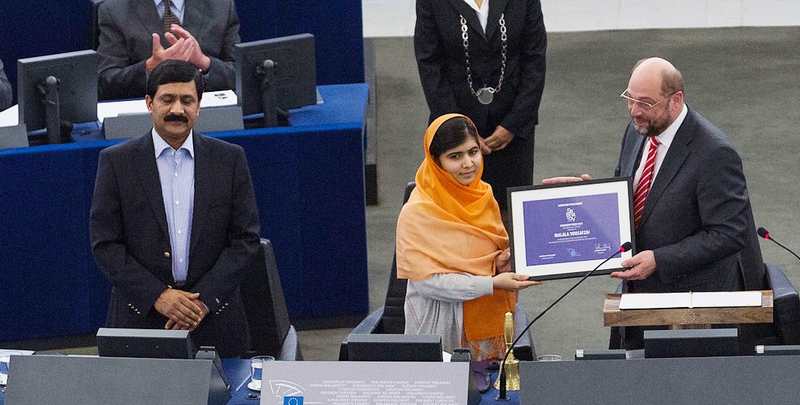 Malala cùng cha (trái) tại buổi trao Giải thưởng Tự do Tư tưởng Sakharov, còn gọi là Giải thưởng Nhân quyền của Liên minh Châu Âu, năm 2013