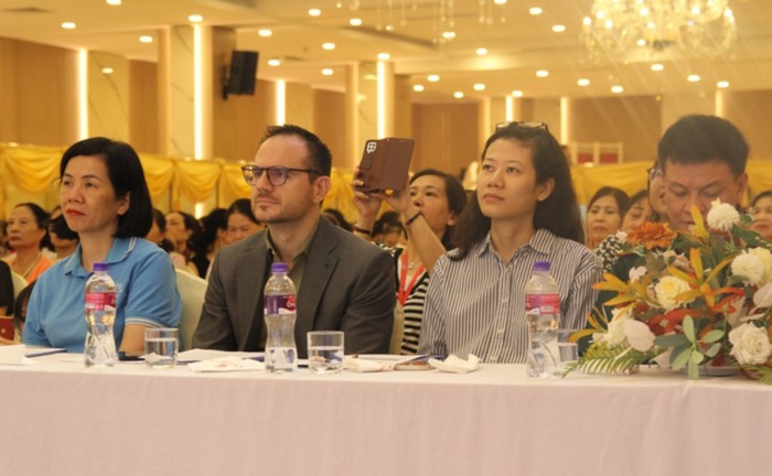Bà Nguyễn Thị Minh Hương, Phó Chủ tịch Hội LHPN Việt Nam và ông Blanco Neuenschwander Federico, Trưởng bộ phận Nhân sự và Tài chính, Tổ chức Di cư quốc tế (IOM) tại Việt Nam (hàng trước, thứ 1, 2 từ trái sang) dự chương trình.