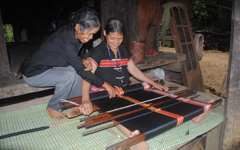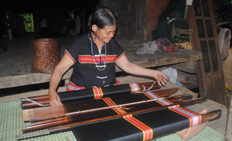 Bà Zơrâm Vứr miệt mài bên khung dệt. Vừa dệt, bà Zơrâm Vứr cho biết: “Tôi sinh ra và lớn lên trong làng có nhiều gia đình làm nghề dệt thổ cẩm. Riêng gia đình tôi thì có mẹ, bà ngoại là tay nghề dệt giỏi, nên từ những năm lên 10, nghe lời mẹ và những phụ nữ lớn tuổi khuyên bảo, tôi đã sớm được tiếp xúc với nghề dệt thổ cẩm. Tôi đã được mẹ, bà ngoại dạy từ cách se chỉ đến nhuộm màu. Để thành thạo với tay nghề dệt như ngày hôm nay, tôi đã phải học hỏi rất nhiều”.