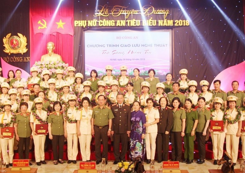 Đại tướng Tô Lâm, Ủy viên Bộ Chính trị, Bộ trưởng Bộ Công an; Thượng tướng Nguyễn Văn Thành, Ủy viên TƯ Đảng, Thứ trưởng Bộ Công an; bà Hoàng Thị Ái Nhiên, Phó Chủ tịch Thường trực Hội LHPNVN, dự và chúc mừng 46 cá nhân tiêu biểu trong phong trào phụ nữ Công an nhân dân năm 2018.