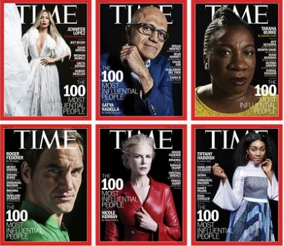 6 nhân vật trong danh sách TIME 100 sẽ được lựa chọn trở thành nhân vật chính trên trang bìa các số đặc biệt của tạp chí Time gồm nhà sáng lập #Me too Tarana Burke, vận động viên quần vợt Roger Federer, diễn viên hài Tiffany Haddish; diễn viên Nicole Kidman; ca sĩ Jennifer Lopez và Giám đốc điều hành Microsoft Satya Nadella.