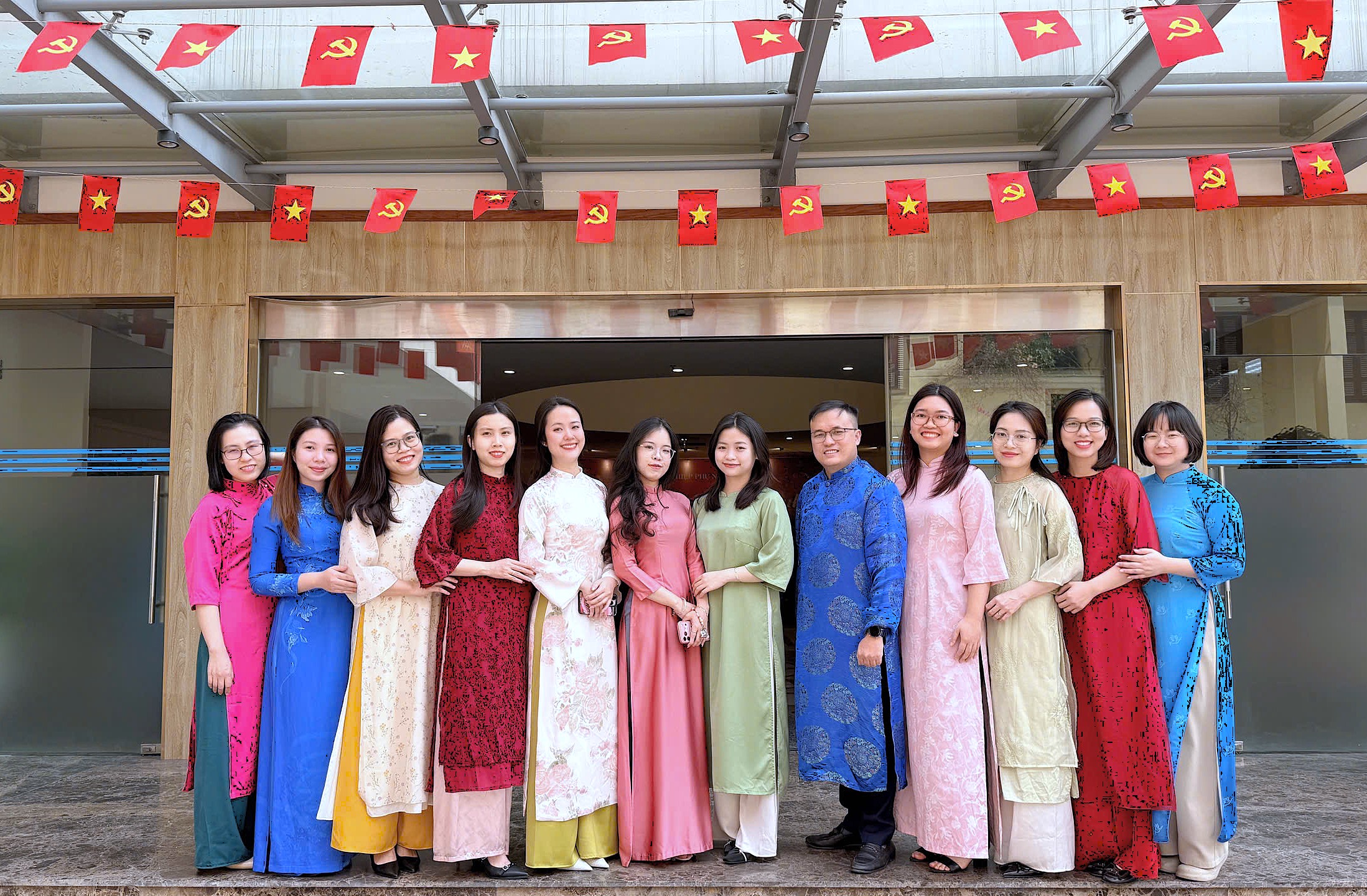 Tân Bí thư Đảng uỷ TW Hội LHPN Việt Nam Lê Thị Thuỷ (Áo dài vàng) cùng các Phó Chủ tịch Hội LHPN Việt Nam Nguyễn Thị Minh Hương (thứ 6 phải sang), Nguyễn Thị Thu Hiền (thứ 8 trái sang) và các lãnh đạo Ban Công tác Phụ nữ, TW Hội LHPN Việt Nam hưởng ứng Tuần lễ Áo dài