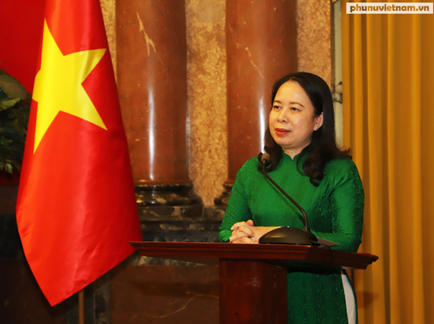 Phó Chủ tịch nước Võ Thị Ánh Xuân phát biểu tại buổi gặp mặt 101 cặp mẹ - con đỡ đầu tiêu biểu tham dự Trại hè "Hoa hướng dương" năm 2023.