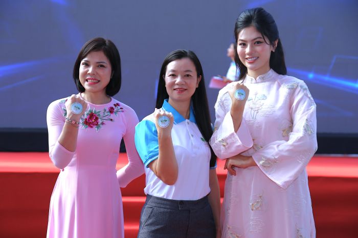 Phó Chủ tịch Hội LHPN Việt Nam Nguyễn Thị Thu Hiền cùng Hoa khôi Miss Photo Vũ Hương Giang (phải ảnh) và Hoa khôi Vẻ đẹp vầng trăng khuyết Bế Thị Băng (trái ảnh) hưởng ứng chương trình