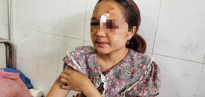 Các vết bầm tím trên gương mặt chị B bị chồng đánh giữa đường