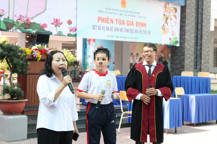 Luật sư Ngọc Nữ thực hiện tư vấn pháp luật tại phiên tòa giả định tại trường học (Nguồn ảnh: Afamily)