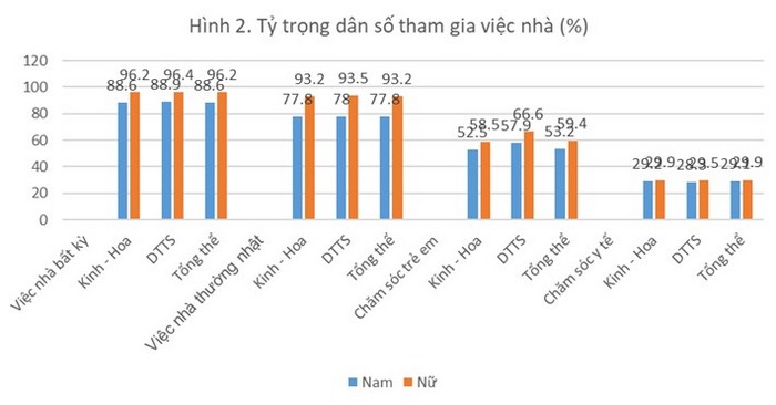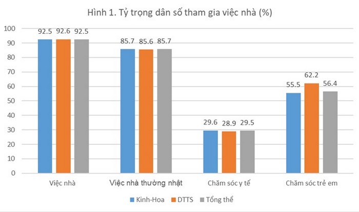 Tỷ trọng dân số (chỉ xét đối với dân số trong độ tuổi lao động) không khác biệt giữa nhóm dân tộc Kinh - Hoa và nhóm dân tộc thiểu số trong việc tham gia việc nhà thường nhật và chăm sóc y tế cho thành viên trong gia đình. Tuy nhiên, việc chăm sóc trẻ em có sự khác biệt 6,7 điểm % giữa sự tham gia của nhóm dân tộc Kinh - Hoa và nhóm dân tộc thiểu số (xem Hình 1). Có tới 62,2% dân tộc thiểu số dành thời gian chăm sóc trẻ em trong gia đình trong khi tỷ lệ này chỉ ở mức 55,5% đối với nhóm dân tộc Kinh - Hoa. Báo cáo tách riêng từng nhóm nhỏ trong các dân tộc thiểu số cũng càng cho thấy sự khác biệt tăng lên đáng kể nhất là với nhóm dân tộc miền núi phía Bắc và Tây Nguyên. Có thể thấy ở khu vực miền núi, nông thôn, nơi phần lớn dân tộc thiểu số sinh sống, gặp phải một rào cản là việc có ít dịch vụ việc nhà hơn so với khu vực đô thị, nơi nhóm Kinh - Hoa sinh sống chủ yếu. Theo đó, càng ở khu vực miền núi có nhịp độ chậm phát triển các dịch vụ việc nhà trên thị trường, càng tăng gánh nặng việc nhà cho nữ giới, nhất là ở công việc chăm sóc trẻ em. Vì vậy, bất bình đẳng theo giới và đối với DTTS vì thế đan xen, càng làm nới rộng khoảng cách lẫn nhau cụ thể đối với công việc chăm sóc trẻ em.
