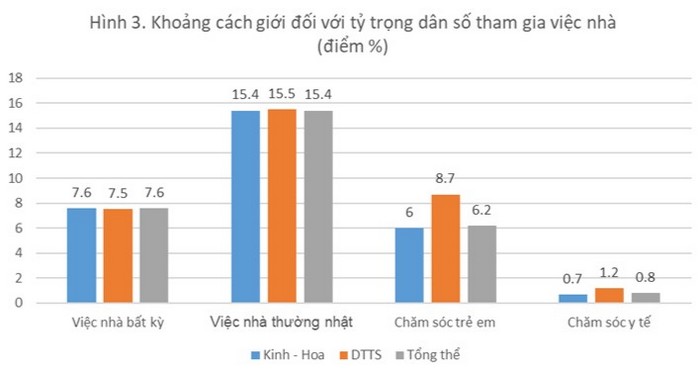 Bất bình đẳng theo giới trong tham gia việc nhà trở nên rõ nét khi khoảng cách giới trong tỷ trọng dân số tham gia công việc này ở mức trung bình 7,6 điểm % gánh nặng hơn cho phụ nữ. Khoảng cách giới lớn nhất đối với nhóm phụ nữ đồng bào dân tộc thiểu số ở việc nhà thường nhật.