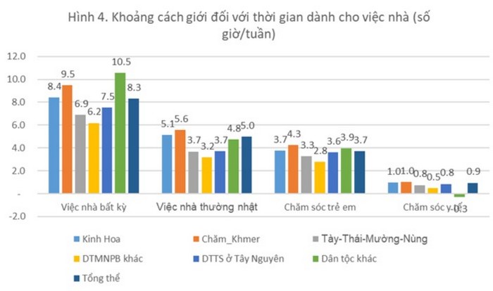 Hình 4 thể hiện trung bình, nữ giới làm việc nhà nhiều hơn so với nam giới 8,3 giờ/tuần. Cụ thể, khoảng cách giới này là 5 giờ/tuần đối với việc nhà thường nhật, 3,7 giờ/tuần đối với chăm sóc trẻ em và 0,9 giờ/tuần đối với chăm sóc y tế. Có thể thấy không hề có sự chênh lệch khoảng cách giới khác biệt giữa nhóm Kinh Hoa và nhóm DTTS. Nhưng nếu xét theo từng nhóm nhó, có thể thấy thời gian dành cho việc nhà bất kỳ của một số nhóm DTTS như nhóm Chăm-Khmer hay nhóm DTTS khác vượt cao hơn hẳn so với nhóm Kinh - Hoa. Đặc biệt đáng lưu ý, nhóm DTTS khác (bao gồm rất nhiều các nhóm có trình độ phát triển thấp nhất) có khoảng cách giới trong thời gian làm việc nhà vượt cao nhất: 10,5 giờ/tuần đối với việc nhà bất kỳ. Nhóm dân tộc miền núi phía bắc khác (ngoài nhóm Tày – Thái - Mường - Nùng, viết tắt là DTMNPB) có khoảng cách giới trong thời gian làm việc nhà thấp nhất: 6,2 giờ/tuần đối với việc nhà bất kỳ.