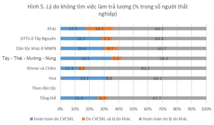 Điều tra riêng với 53 DTTS ở cấp đại diện toàn quốc cho giai đoạn 2021 đã cho thấy 23,9% chủ hộ DTTS  đang thất nghiệp vì việc nhà khiến họ không tìm được công việc có trả lương.