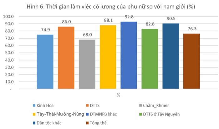 Hình 6 cho thấy thời gian phụ nữ dành cho việc làm có trả lương chỉ bằng 76,3% thời gian dành cho việc làm có trả lương của nam giới. Ở mức độ thấp nhất, thời gian làm việc có lương của phụ nữ Khmer-Chăm chỉ bằng 68% thời gian làm việc có trả lương của nam giới, so với tỷ lệ chung của tất cả các DTTS là 86%. Bất bình đẳng giới càng rõ nét ở góc độ theo nhóm dân tộc.