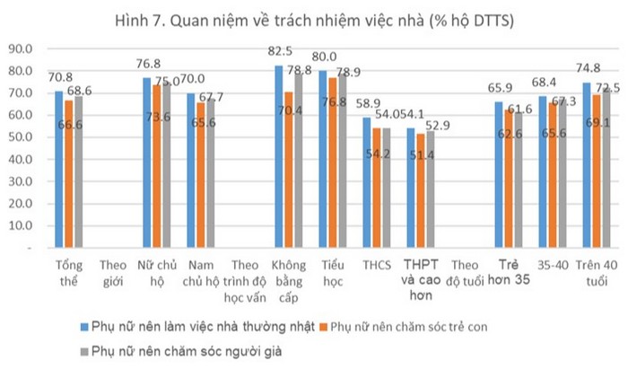 Rào cản tham gia thị trường lao động đang đến từ chính sự cân nhắc trách nhiệm việc nhà đè lên vai nữ giới. Vẫn còn rào cản lớn về mặt định kiến cho rằng việc nhà là của riêng phụ nữ. Điều này được khẳng định qua dữ liệu điều tra đối với nhóm DTTS (xem Hình 7). 70,8% hộ DTTS cho rằng phụ nữ nên đảm nhiệm việc nhà thường nhật. 66,6% hộ DTTS quan niệm rằng phụ nữ nên gánh vác việc chăm sóc trẻ em. Theo 68,6% hộ DTTS, phụ nữ nên chịu trách nhiệm chăm sóc người ốm. Đáng chú ý, bản thân nhóm nữ giới càng có suy nghĩ này nhiều hơn nhóm nam giới (tỷ lệ phụ nữ có quan điểm này cao hơn (76,8%) so với nam giới (70%)).
