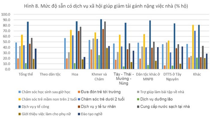 Việc tháo dỡ rào cản việc nhà thường nhật cũng như công việc chăm sóc trẻ em là có tính tiềm năng vì hiện trạng mức độ sẵn có của nhiều dịch vụ xã hội giảm tải việc nhà đều đang chưa ở mức cao, đặc biệt đối với dịch vụ chăm sóc trẻ em ở nhóm DTTS (Hình 8).