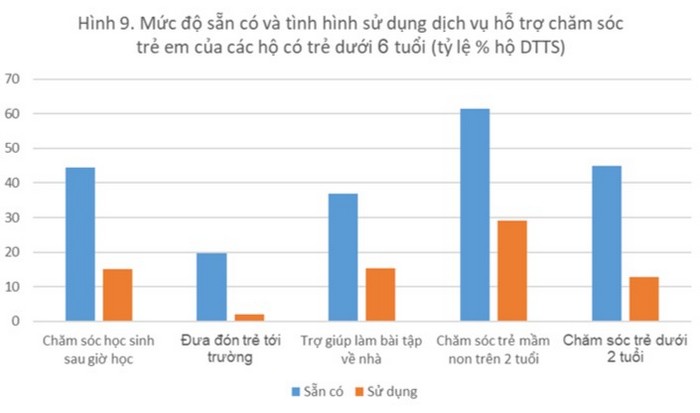 Tuy nhiên, ngoài mức độ sẵn có thấp đối với dịch vụ xã hội để san sẻ trách nhiệm việc nhà hơn nữa giữa gia đình và nhà nước, còn có một rào cản nữa là khả năng tiếp cận và sử dụng các dịch vụ sẵn có đấy. Một tình trạng điển hình đó là việc sử dụng dịch vụ chăm sóc trẻ em hiện có của các hộ DTTS có con em dưới 6 tuổi còn rất hạn chế. Hình 9 cho thấy cứ 10 hộ đồng bào dân tộc thiểu số có trẻ dưới 6 tuổi thì chỉ 3 hộ cho biết họ có gửi trẻ đến các cơ sở trông trẻ mặc dù độ sẵn có dịch vụ ở một tỷ lệ cao hơn đáng kể.