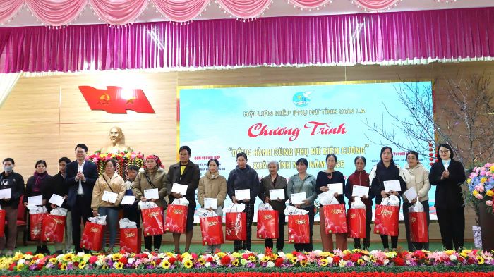 Trao quà cho hội viên người dân và phụ nữ nghèo trên địa bàn xã Chiềng Sơn Trong chương trình, Hội LHPN tỉnh đã phối hợp cùng nhiều cơ quan chính quyền, đơn vị, doanh nghiệp, lực lượng vũ trang, ngân hàng và các nhà hảo tâm trên địa bàn tỉnh tham gia tài trợ và tổ chức các hoạt động như: tặng 24 lá cờ Tổ quốc và ảnh Bác Hồ cho các bản; 31 suất quà cho gia đình chính sách; 216 suất quà Tết cho hội viên, phụ nữ nghèo, hộ khó khăn; 50 suất sữa cho Trường Mầm non Chiềng Sơn.
