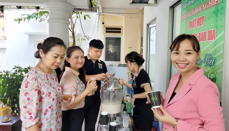 Các đại biểu thử sản phẩm Trà sữa Béo - một sản phẩm khởi nghiệp của chị Phạm Thị Thùy Trang