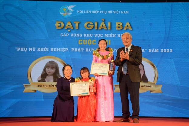 Kết quả, có 5 dự án được trao giải khuyến khích; 2 giải ba được trao cho dự án "Mô hình sản xuất và kinh doanh hoa sáp" của chị Bùi Thị Yến Nhi (Hậu Giang) và dự án "Xây dựng trang trại chăn nuôi cà cuống và chế biến sản phẩm từ cá cuống" của chị Hoàng Thị Hương (Tây Ninh); 2 giải nhì được trao cho dự án "Khởi nghiệp các sản phẩm đan móc từ len sợi" của chị Đoàn Thị Thành (Bình Phước) và dự án "Muối thảo dược Cần Giờ" của chị Nguyễn Thị Bạch Tuyết (TPHCM); 2 giải nhất được trao cho dự án "Phát triển sản xuất sữa hạt sen tổ yến theo chuỗi phát triển bền vững" của chị Lưu Thị Mỹ Duyên (Đồng Tháp) và dự án "Dầu gội dược liệu N22 - siêu sạch gàu, ngăn rụng tóc" của chị Đặng Thị Kim Ngọc (Hậu Giang).