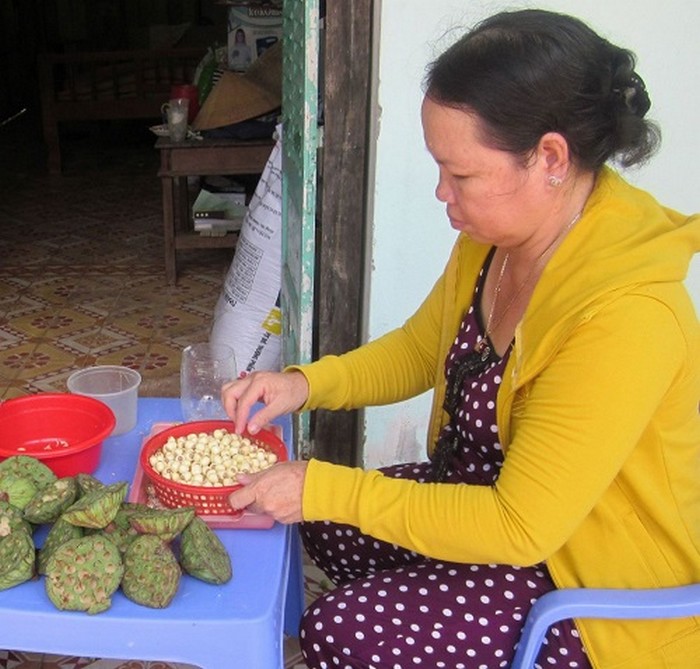 Chị Võ Thị Trúc Ly tranh thủ lúc nông nhàn nhận bóc vỏ hạt sen để thêm thu nhập Trời quá trưa, chị Trần Thị Phương và con trai út (đang học lớp 10) vừa hoàn thành bóc vỏ 3,5kg hạt sen thành phẩm trắng sạch, tiền công khoảng 100.000 đồng. Chị Phương cho biết: “Mỗi sáng sớm, tôi đến cơ sở phân phối nhận gương sen về nhà bóc vỏ, tranh thủ làm việc nhà. Lúc đầu, tôi chưa quen việc, làm chậm nên mỗi ngày kiếm được chỉ hơn 10.000 đồng. Sau quen dần, tiền công nhật tăng lên. Hiện việc làm mướn bấp bênh, thu nhập không ổn định, tôi chịu khó giữ công việc này để trang trải chi phí sinh hoạt gia đình”. Lúc trước, khi các con còn nhỏ, gia đình chị Phương thuộc diện hộ nghèo, vợ chồng chị làm mướn kiếm sống. Năm 2012, chị Phương được xã tặng nhà Đại đoàn kết, Hội Phụ nữ giới thiệu vay vốn ưu đãi 20 triệu đồng để làm ruộng, nuôi heo, trồng dừa. Vài năm sau, 2 con trai lớn của anh chị đi làm công nhân ở Bình Dương, hằng tháng gửi tiền về phụ giúp cha mẹ, nuôi em út học hành. Năm 2014, chị Phương được xét thoát nghèo. Giờ kinh tế gia đình khá ổn định nhưng chị Phương vẫn duy trì việc bóc vỏ hạt sen để đảm bảo việc làm, thu nhập thường xuyên.