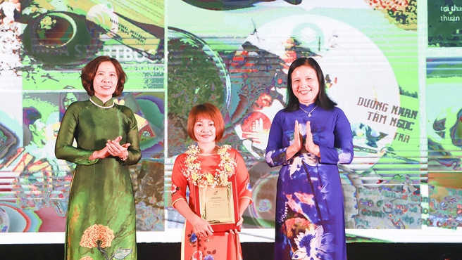 Đại diện Hội LHPN Việt Nam và đại diện Hội LHPN Hà Nội trao bằng khen cho các tác giả có sáng tạo được vinh danh năm 2020.
