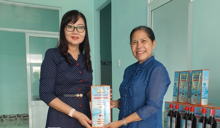Giám đốc điều hành Công ty Cổ phần Vũ - Võ Bạc Liêu -Võ Thị Hồng Thoại (bên phải) giới thiệu nước mắm cá cơm Thiên Phú.
