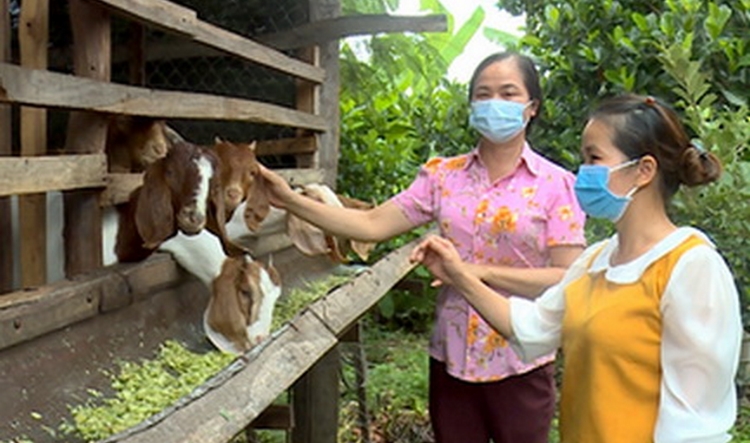 Chị Bình (bên phải) đang giới thiệu mô hình nuôi dê của gia đình