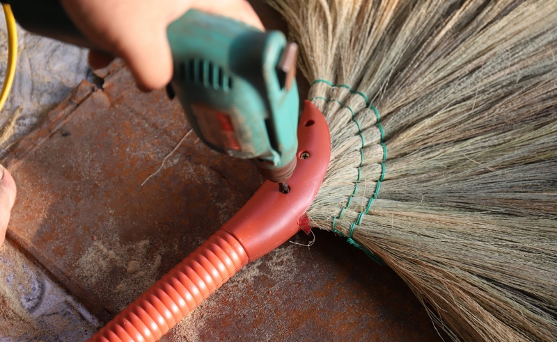 Sau khi hoàn tất xâu "chân tít" thì sẽ dùng máy bắn đinh vít để cố định phần đầu của chổi và cán nhựa. Chổi cán đót cũng làm các công đoạn tương tự chổi cán nhựa. Điểm khác là ở phần "chân tít" được kết 2 vòng bằng dây mây.