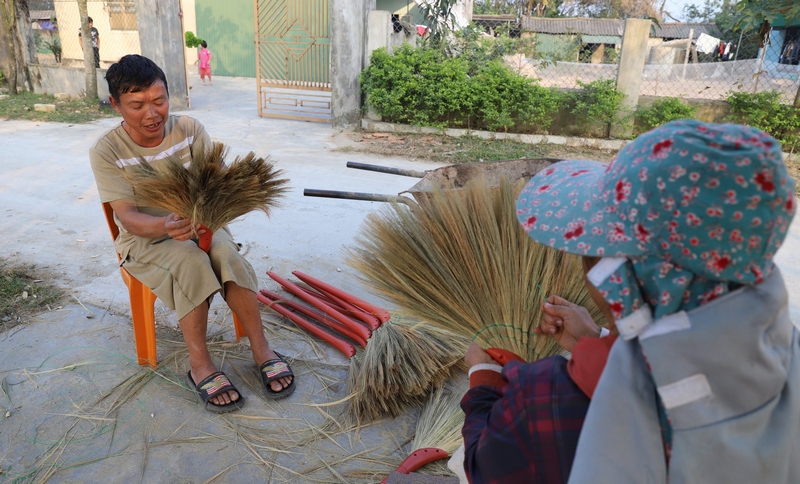 Để làm ra một cây chổi cần rất nhiều công đoạn, vì vậy những thành viên trong gia đình đều chia nhỏ phần công việc để cùng làm.