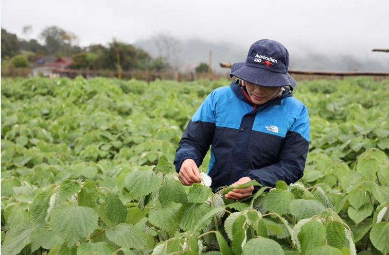 Phụ nữ dân tộc Thái ở xã Liên Hòa, huyện Vân Hồ, tỉnh Sơn La chăm sóc cây gai xanh