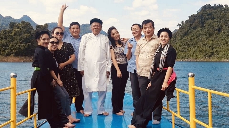 Chẩu Thị Nga (ngoài cùng bên phải) dẫn khách tham quan hồ sinh thái Na Hang (Lâm Bình).