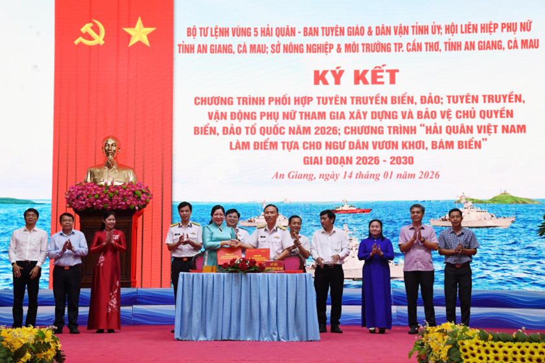 Bộ Tư lệnh Vùng 5 Hải quân và Hội LHPN tỉnh An Giang ký kết chương trình phối hợp năm 2026 Trong năm 2025, Hội LHPN tỉnh đã chủ động xây dựng kế hoạch phối hợp với Bộ Tư lệnh Vùng 5 Hải quân thực hiện công tác tuyên truyền, nâng cao nhận thức, ý thức trách nhiệm của cán bộ, hội viên, phụ nữ và chiến sĩ Vùng 5 về vị trí, vai trò, tầm quan trọng của biển, đảo Việt Nam, vùng biển Tây Nam trong sự nghiệp xây dựng và bảo vệ Tổ quốc. Vận động gia đình, người thân chấp hành nghiêm Chỉ thị số 32-CT/TW, ngày 10/4/2024 của Ban Bí thư về tăng cường sự lãnh đạo của Đảng đối với công tác chống khai thác thủy sản bất hợp pháp, không báo cáo, không theo quy định và phát triển bền vững ngành thủy sản. Tuyên truyền về kết quả phân giới, cắm mốc trên đất liền giữa Việt Nam và Campuchia, đấu tranh phản bác quan điểm, tư tưởng sai trái của các thế lực thù địch đối với biên giới quốc gia và chủ quyền biển, đảo Việt Nam, các hành vi vi phạm pháp luật Việt Nam và luật pháp quốc tế trên biển; các hoạt động khai thác trái phép, vi phạm chủ quyền quốc gia, ảnh hưởng đến quan hệ các nước trong khu vực; chủ động phòng ngừa, ứng phó với biến đổi khí hậu, nước biển dâng, cứu hộ, cứu nạn trên biển, bảo vệ ngư dân; khơi dậy lòng yêu nước, yêu biển, đảo quê hương...